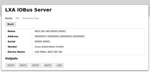 IOBus Server overview of the discovered nodes. Clicking on a node in the list shows more information about that node and allows interacting with it.